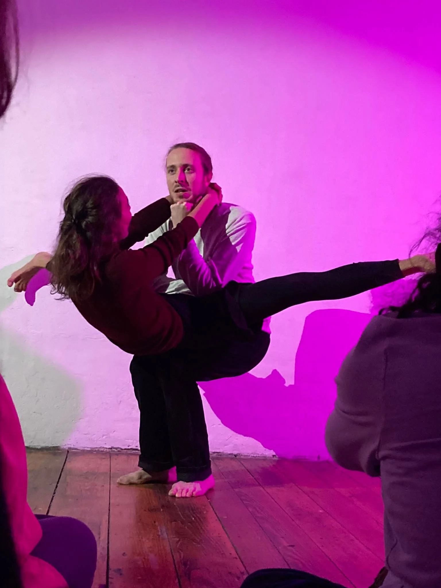 Using impulses from the audience (drawings, clothes, words…) and the space around, they experiment with improvised body movements, spontaneous connections, and unexpected words or sounds.